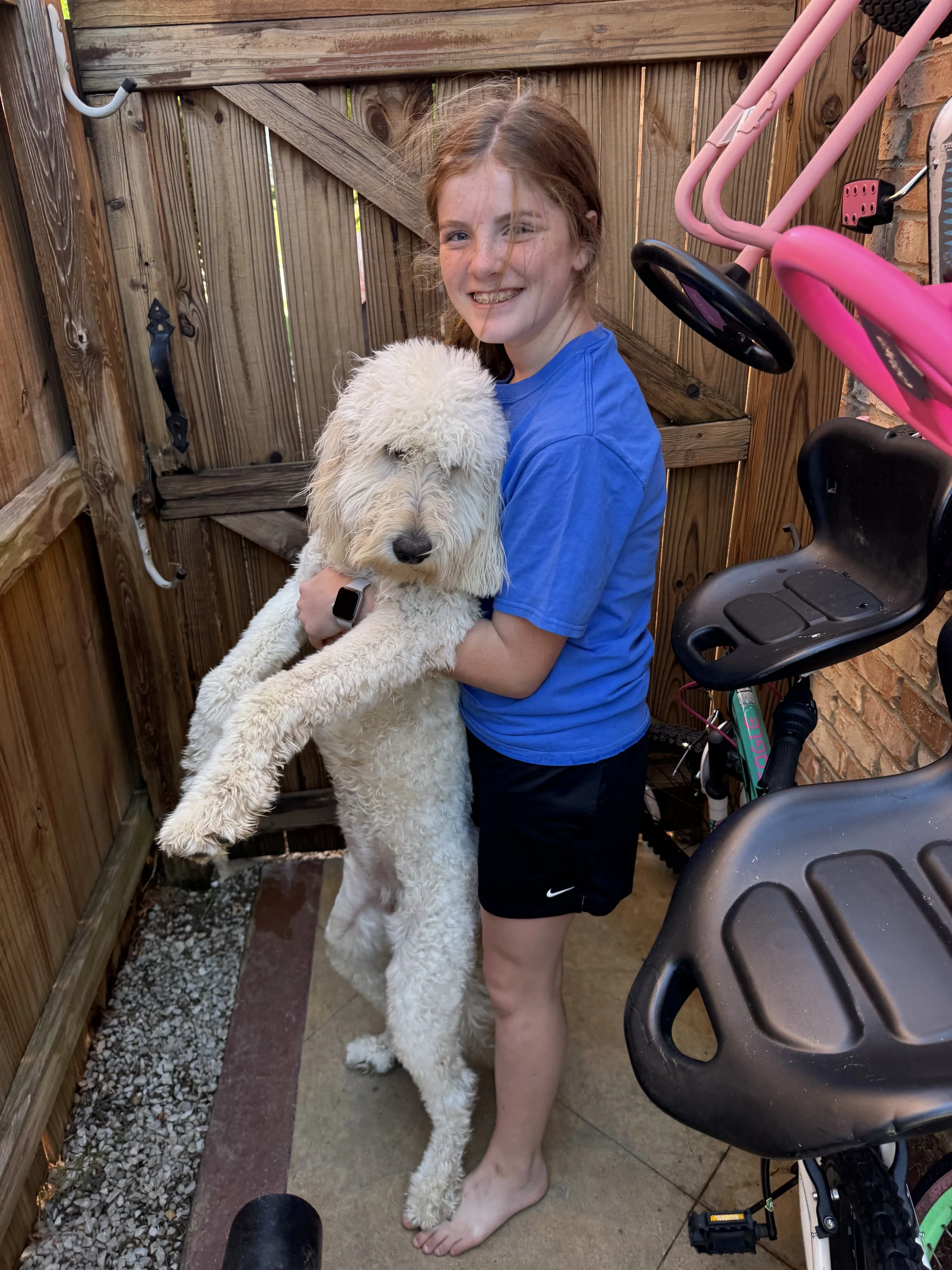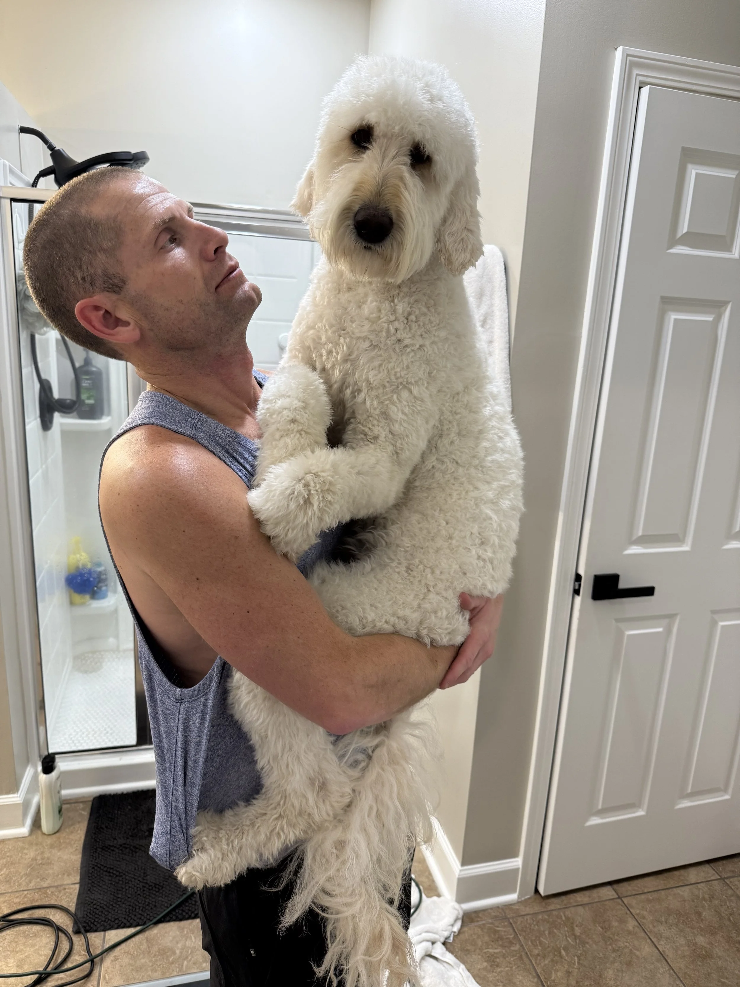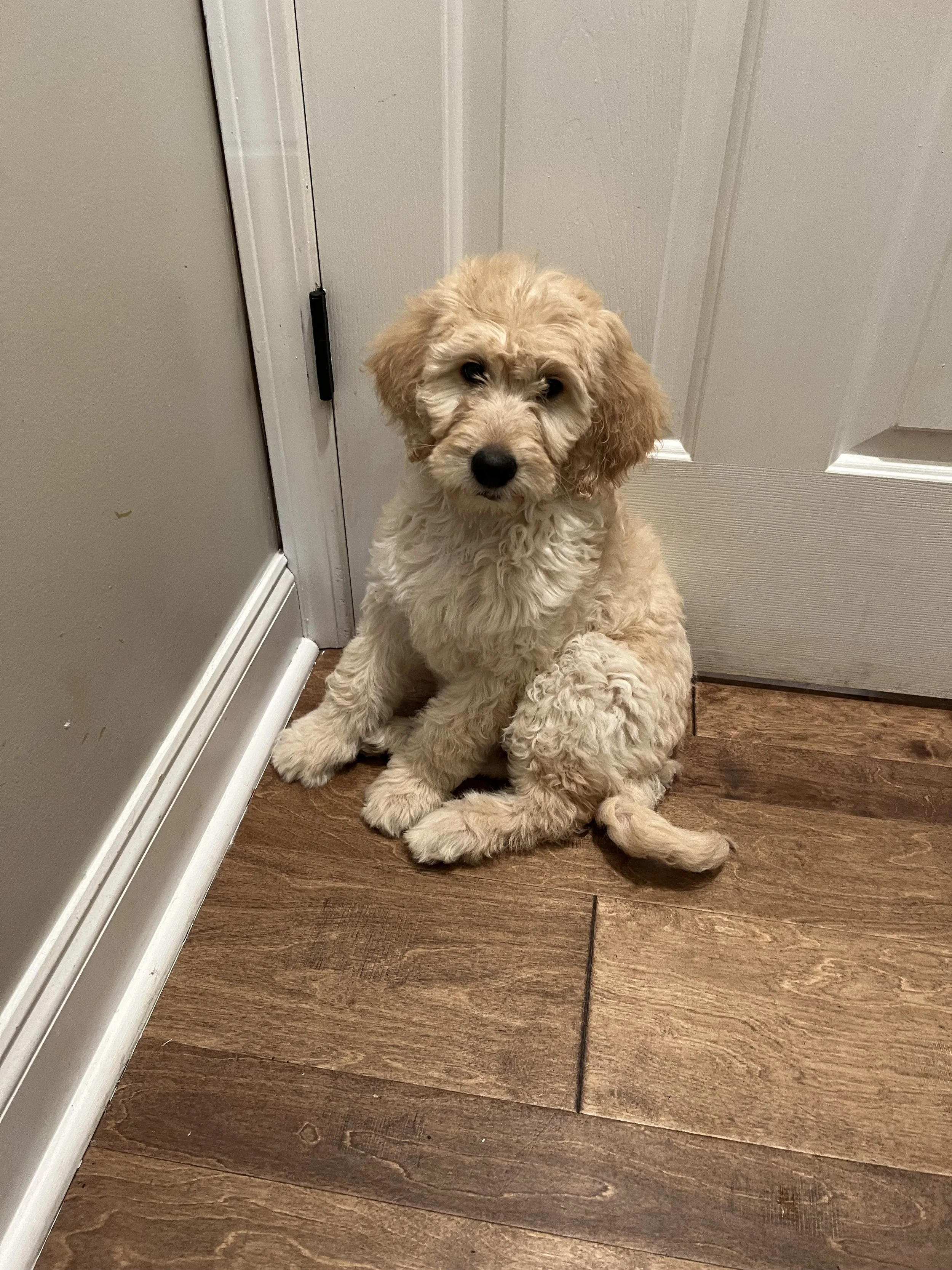Belle is a healthy, Embark tested F1B golden doodle. Her parents are a golden retriever and an AKC registered poodle. Puppies are raised in our home, dewormed at 2, 4, and 6 weeks, and vaccinated at 6 and 8 weeks. The dad, Bruno, is an AKC registered poodle. He is a pure blood and has an excellent health background. We prioritize health and care when raising our puppies.